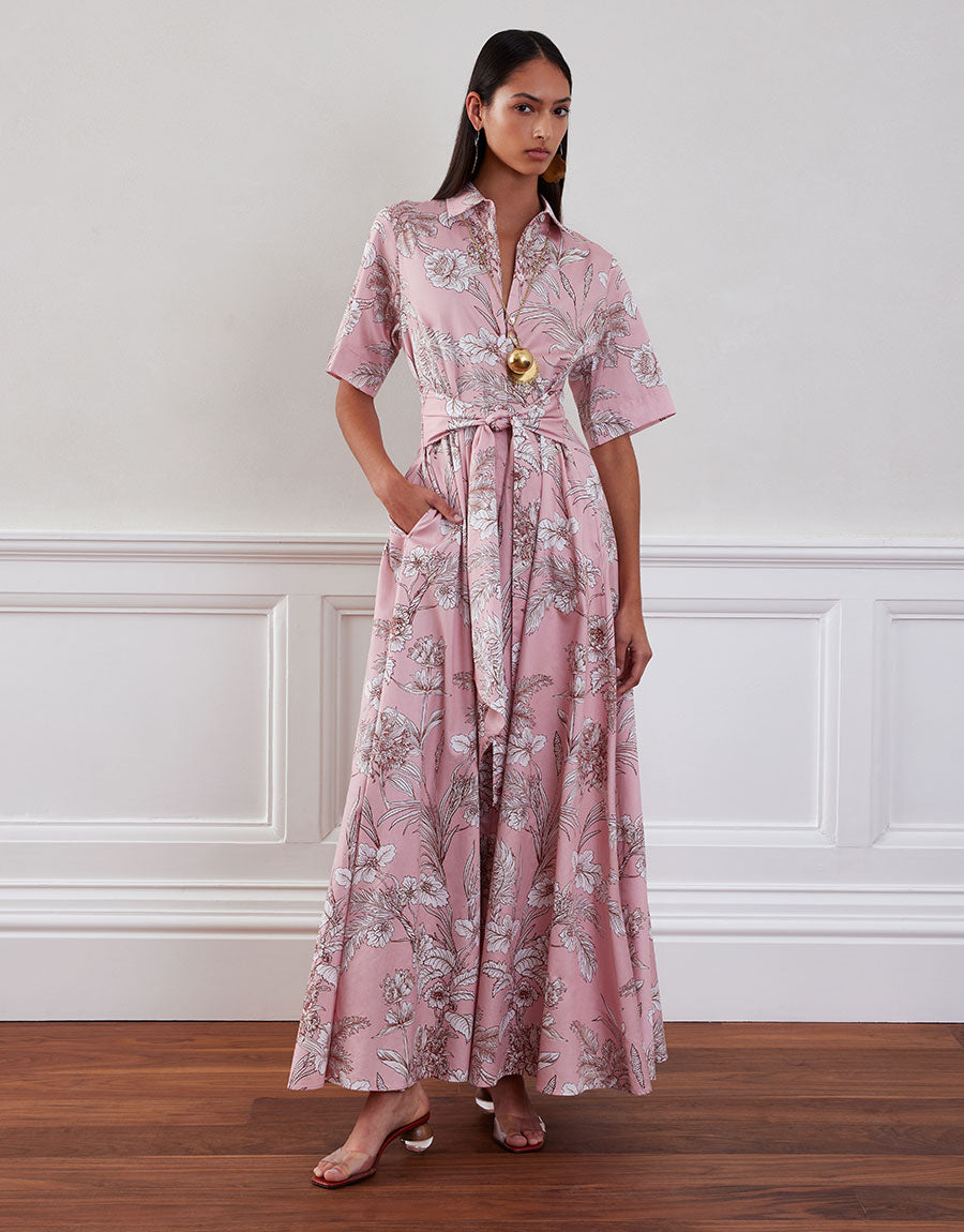 A modern take on the shirt dress: boxy sleeves, a cinched waist, pockets and a dramatic button-down skirt that moves beautifully. In Jungle Pink, a powder-pink and maroon tropical print, Posie is minimal in structure, maximal in effect.